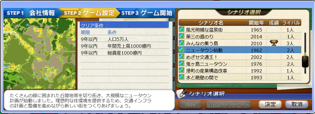 万山支社 1話 2019年07月19日 ニュータウン始動 0 PC版にて追加されたシナリオ「ニュータウン始動」。 クリア条件は9年以内に「人口5万人」「年間売上高1000億円」「総資産1000億円」※標準の場合。 この中売上高と総資産は何とかなりそうなので、人口がノルマ。 つづきはこちら PR
